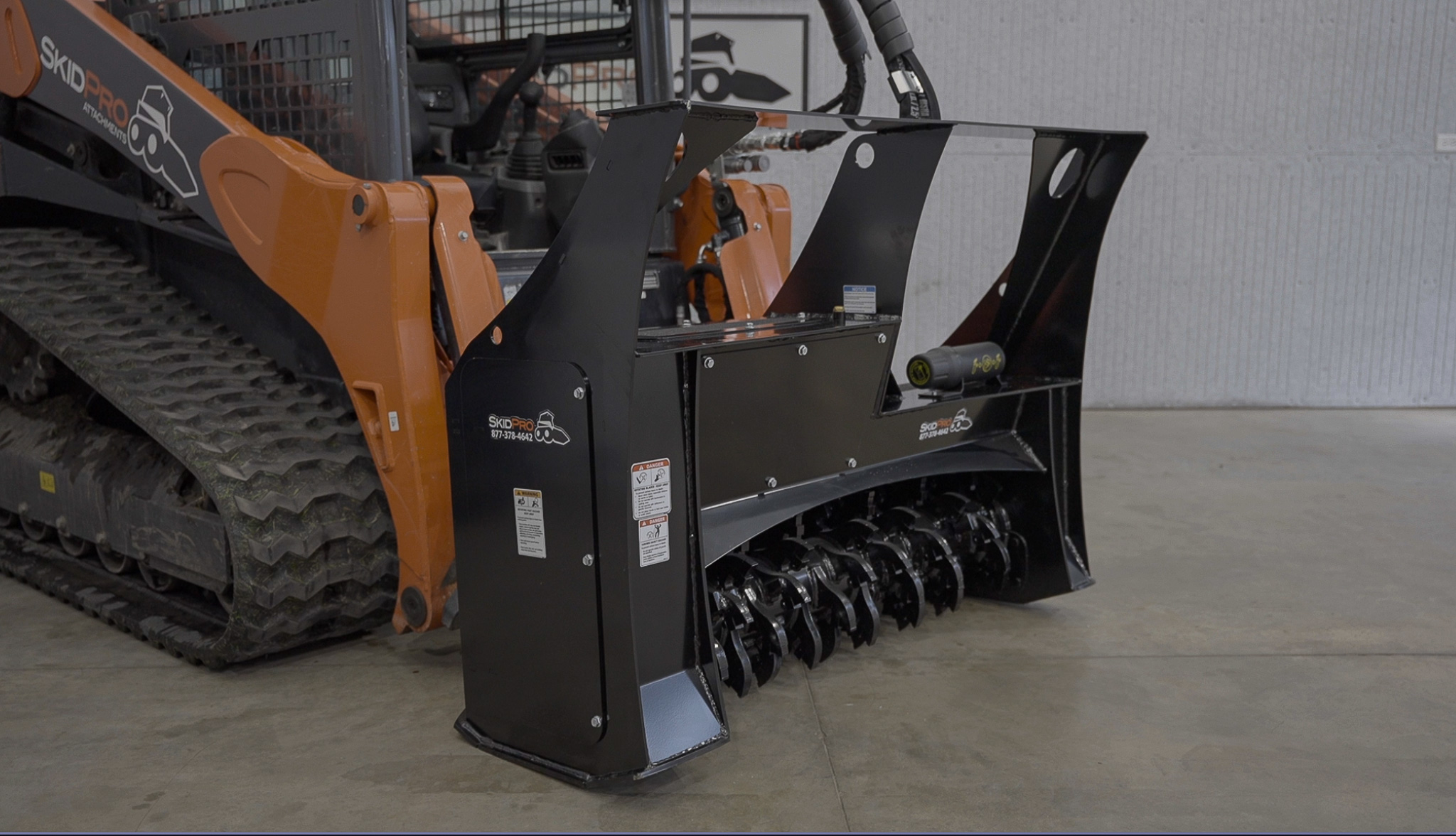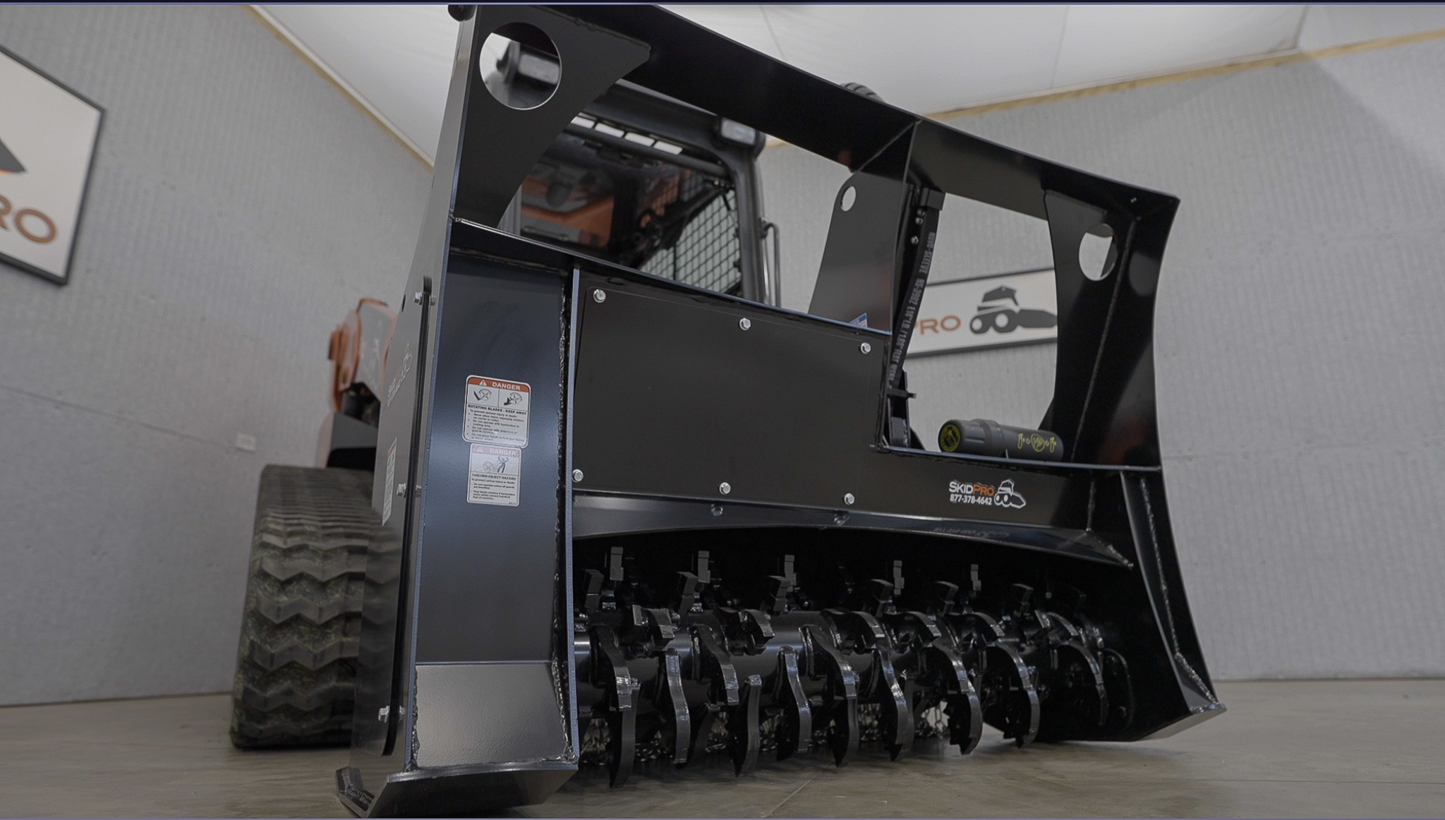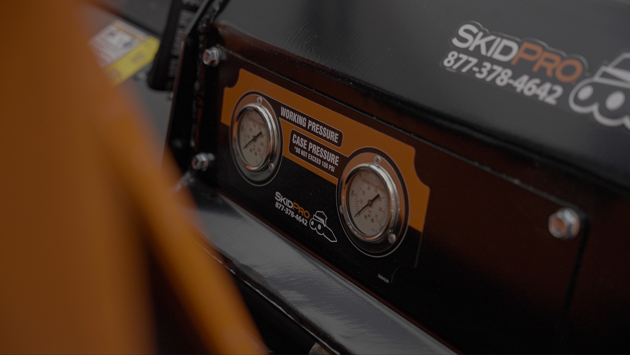 Skid Pro's HD Forestry Mulcher is built for power, durability, and precision, making it the ultimate solution for land clearing. Our Skid Steer Forestry Mulcher has an HD frame and reinforced push bar to deliver commercial-rated strength and durability. Designed with high-flow and standard-flow options, this forestry mulcher features a flow-matched motor for superior performance, an ultra-HD drive train for maximum torque, and carbide-faced teeth for long-lasting cutting power. A visible pressure gauge on this low-flow mulcher for skid steer allows easy monitoring, while high-flotation skid shoes keep teeth out of the dirt. All these features make it an ideal choice to tackle the toughest land-clearing jobs.