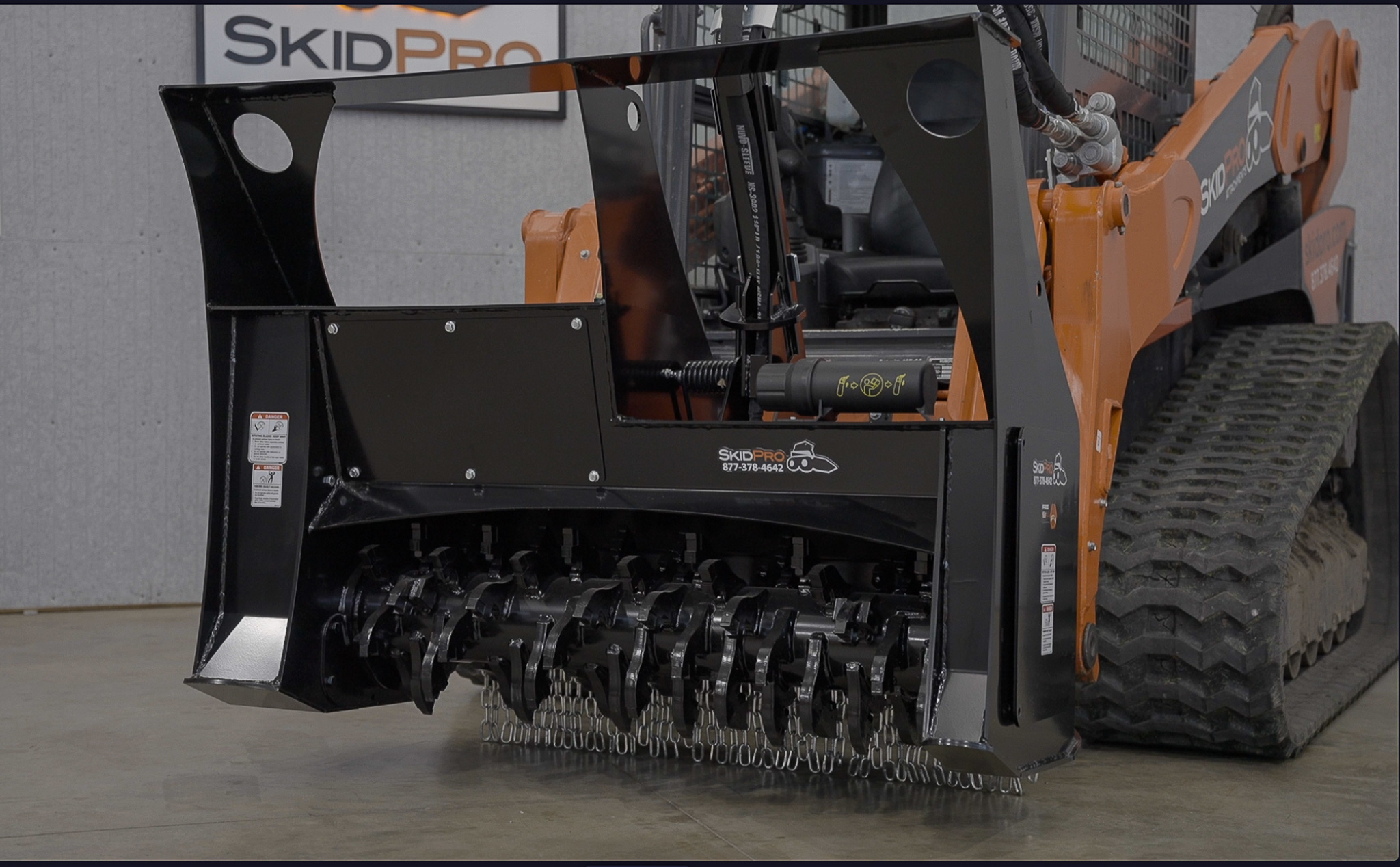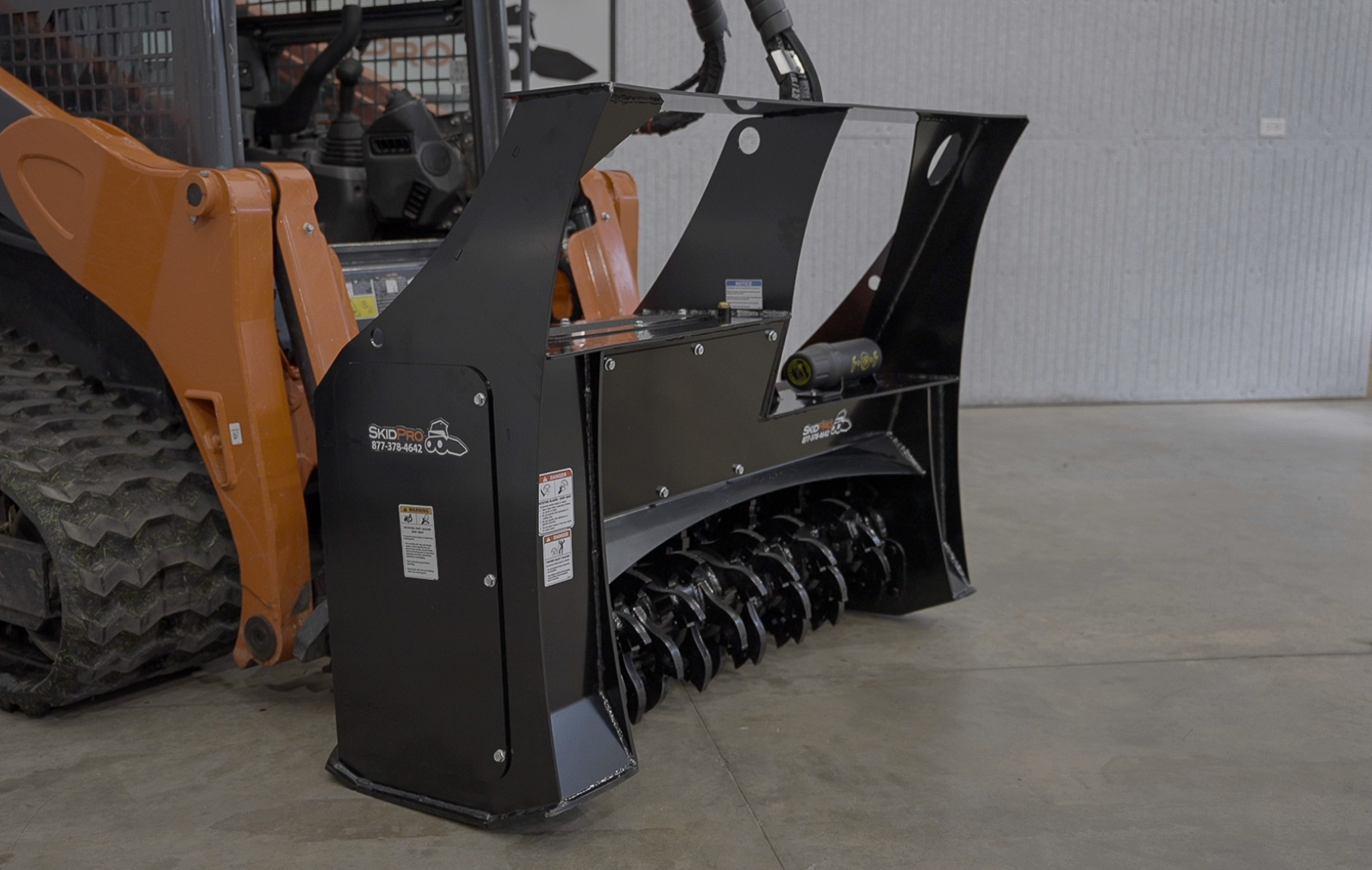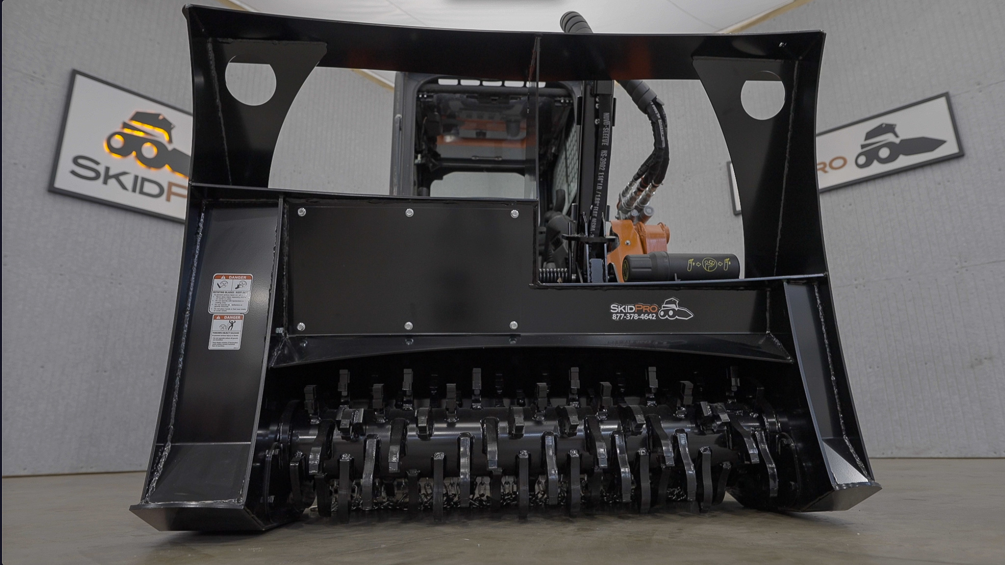 Skid Pro's HD Forestry Mulcher is built for power, durability, and precision, making it the ultimate solution for land clearing. Our Skid Steer Forestry Mulcher has an HD frame and reinforced push bar to deliver commercial-rated strength and durability. Designed with high-flow and standard-flow options, this forestry mulcher features a flow-matched motor for superior performance, an ultra-HD drive train for maximum torque, and carbide-faced teeth for long-lasting cutting power. A visible pressure gauge on this low-flow mulcher for skid steer allows easy monitoring, while high-flotation skid shoes keep teeth out of the dirt. All these features make it an ideal choice to tackle the toughest land-clearing jobs.