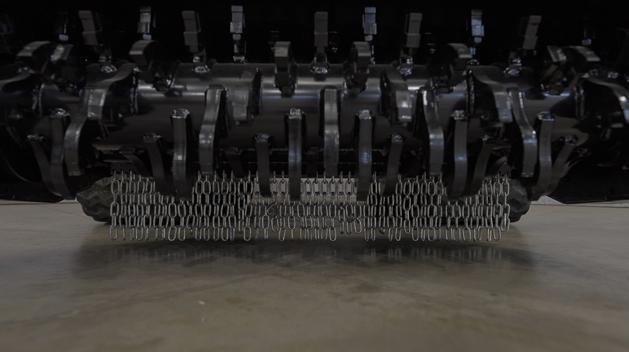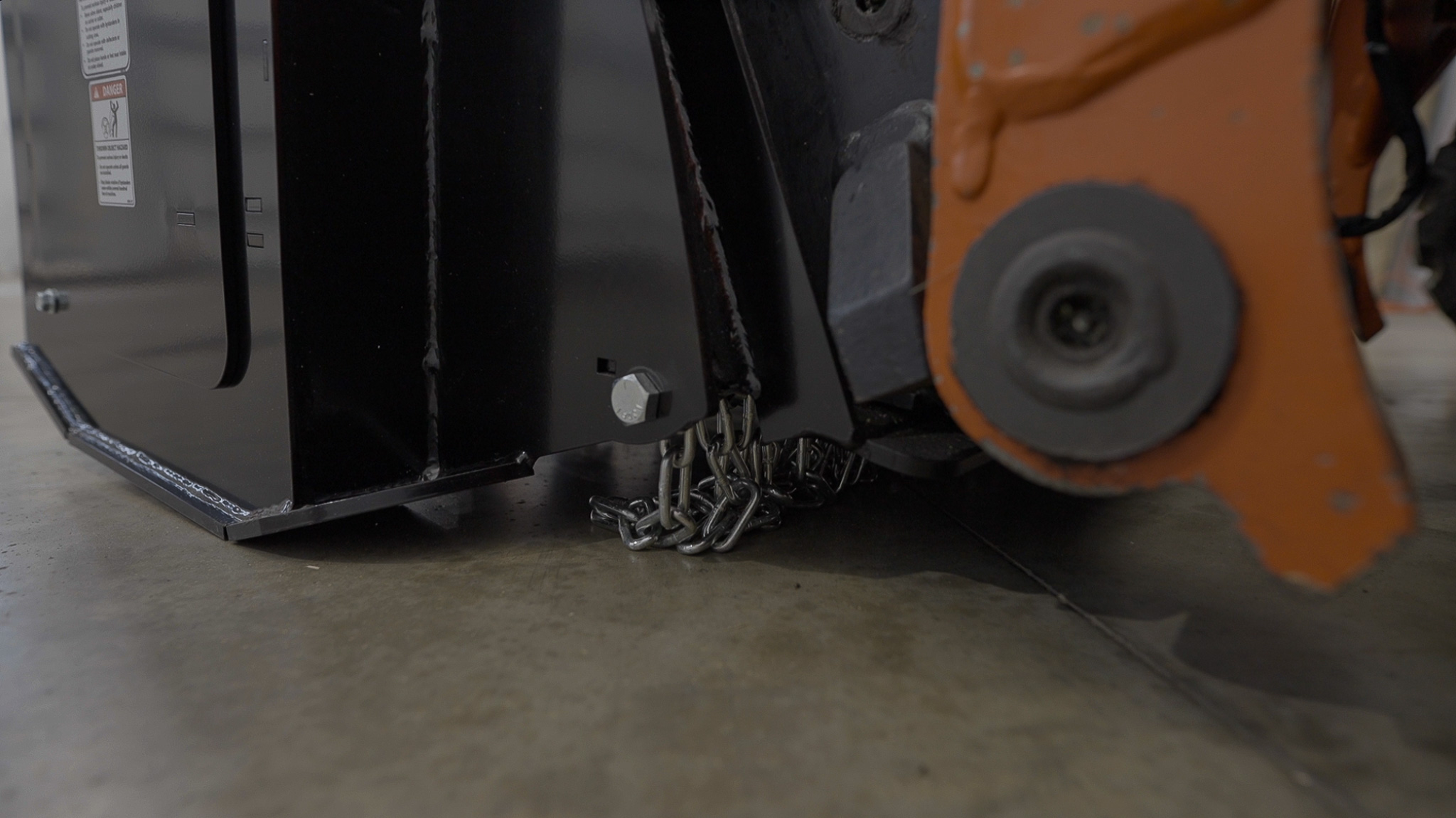 - Rear discharge chains help to contain flying debris and limit debris discharge